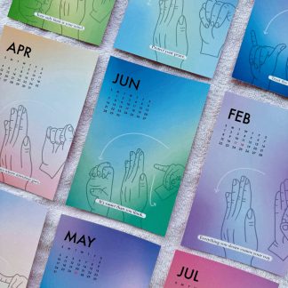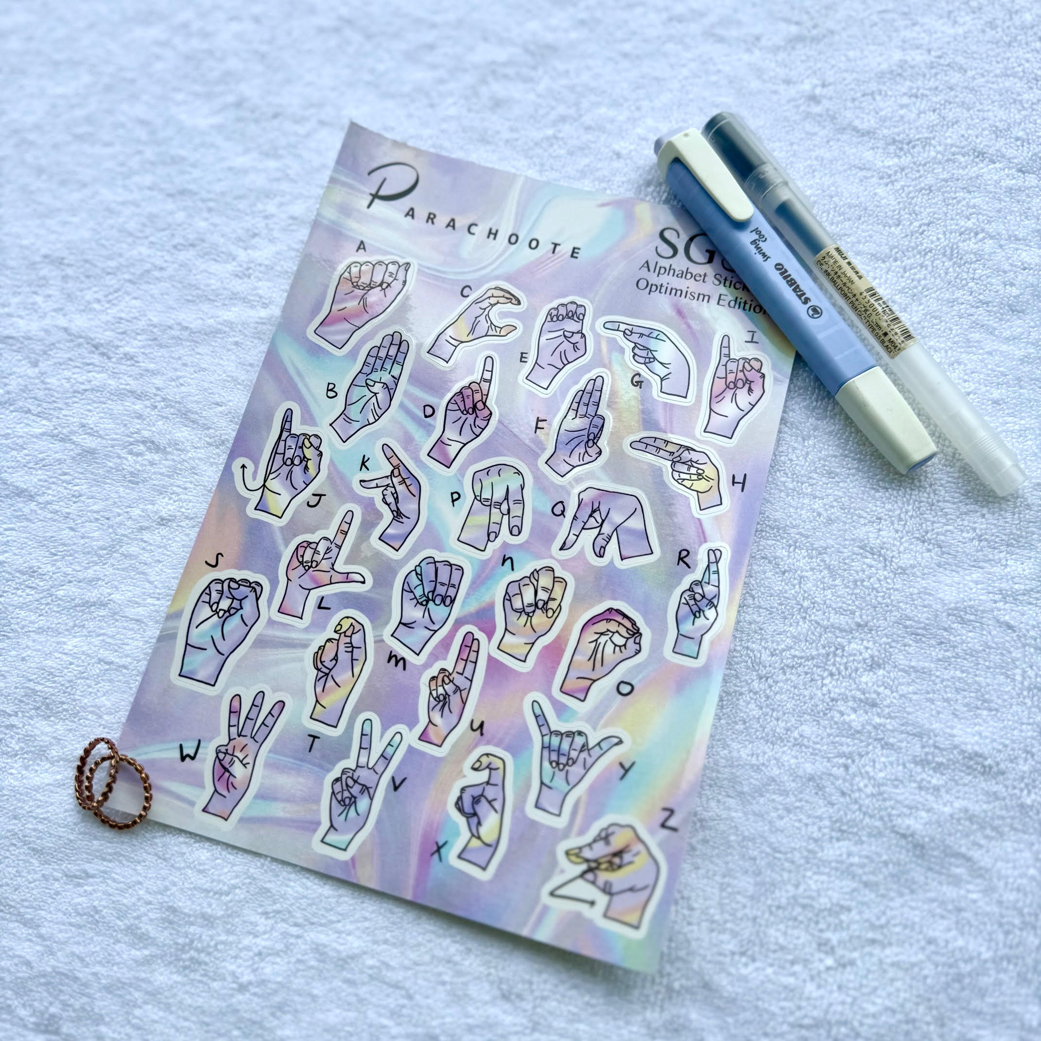 A non-conventional alphabet sticker sheet that you can use to finger spell.
